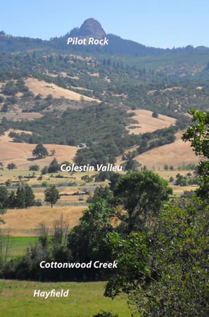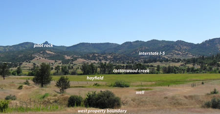 The remaining 12 acres are on a rise overlooking the hay field. These acres are partially wooded, have an approved building site with valley views and views of Mt. Shasta, Mount Ashland, and Pilot Rock. It is a very private location. The phone line crosses the building site (underground), and electric power comes to edge of property (about 150 feet from building site). There is also a well on the property, which we have never used – but it was tested at 9 gal/minute when it was drilled in 1990, and water in the well pipe actually comes to the surface without pumping. The 40 acre hay field is not rocky, nearly level and drains well in the winter. It is ideal for pasture, many kinds of farm crops, equestrian facility, etc.